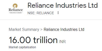 The current market capitalization of Reliance Industries, as you can see, is 16.00 trillion INR, which is about 16,11,396 crore. It means that if you want to buy all of Reliance Industries shares, you have to pay them Rs. 16 lakh crores. I know that in our dream, this won't happen. Therefore, I gave an illustration to make it clear.